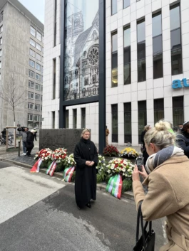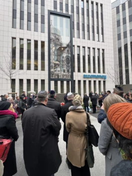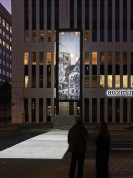 Mischa Kuball identifiziert eine oft passierte, doch kaum wahrgenommene Situation im städtischen Umfeld der Graf-Adolf-Straße in Düsseldorf. An der Kasernenstraße stand bis einst Düsseldorfs zentrale Synagoge. Im Zuge der Novemberpogrome von 1938 wurde sie am 10. November in Brand gesetzt und wenige Wochen später schließlich abgebrochen.